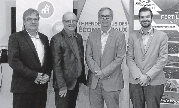 —PHOTO FOURNIE:  Daniel Pitre, conseiller en développement des collectivités à la Société d’aide au développement des communautés des Sources, Hugues Grimard, préfet de la MRC des Sources, André Bourassa, architecte et cofondateur du Rendez-vous ainsi que Frédéric Marcotte, directeur général de la MRC des Sources, annonçaient mercredi la programmation du 3e Rendez-vous des écomatériaux.